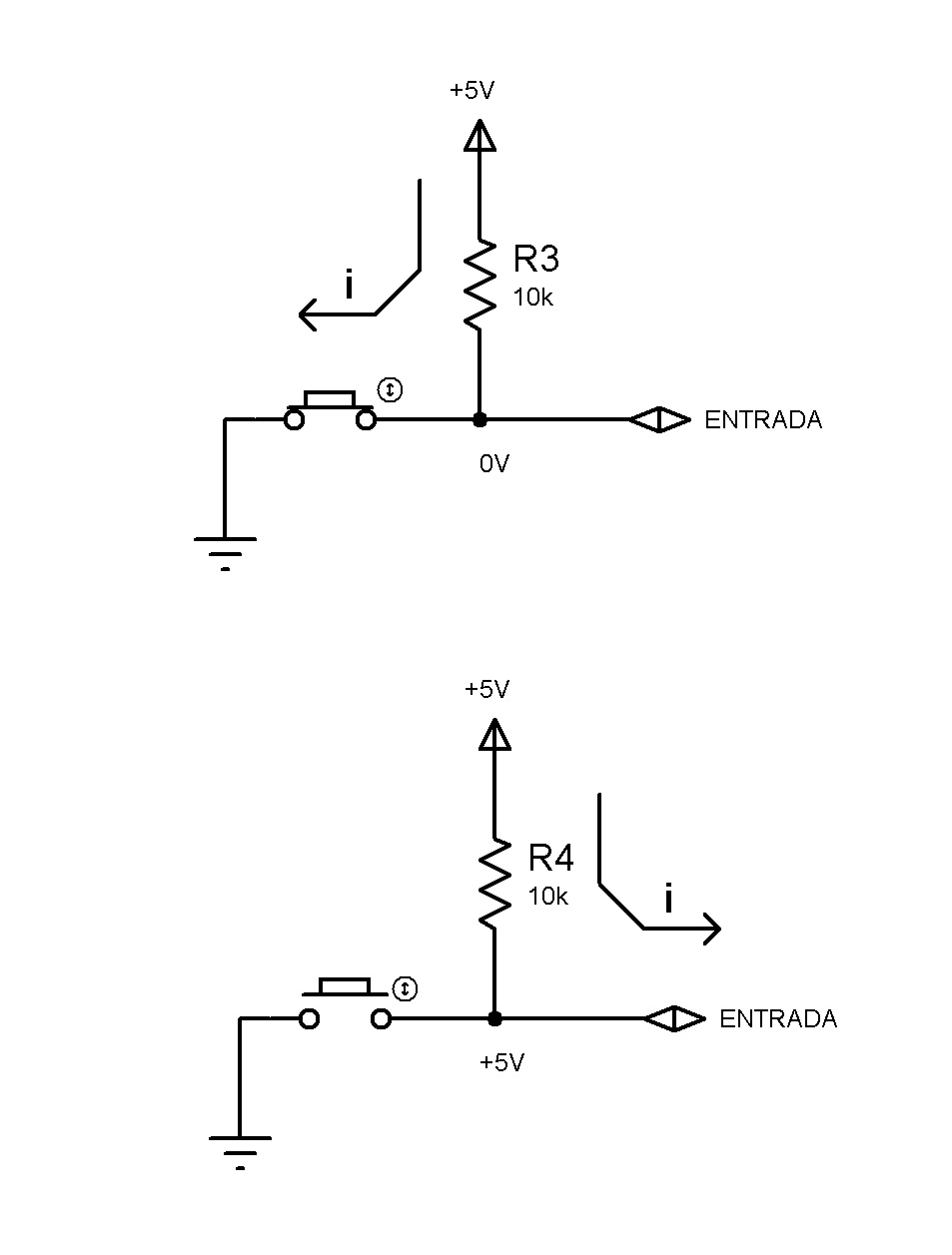 Como su nombre indica esta resistencia tiene la función de “jalar” hacia “arriba”, lo que significa que polariza el voltaje hacia el voltaje de fuente (VDD) que puede ser +5V o +3.3V. De esta forma cuando el pulsador está abierto o en reposo, el voltaje en la entrada del Arduino siempre será de +5V. Las entradas del Arduino son de alta impedancia lo que significa que la corriente que circulará por esa línea sea mínima en el orden de los micro-amperios, por lo que el voltaje que “cae” en la resistencia pull-up es mínimo y tenemos casi el mismo voltaje de fuente en la entrada del Arduino.